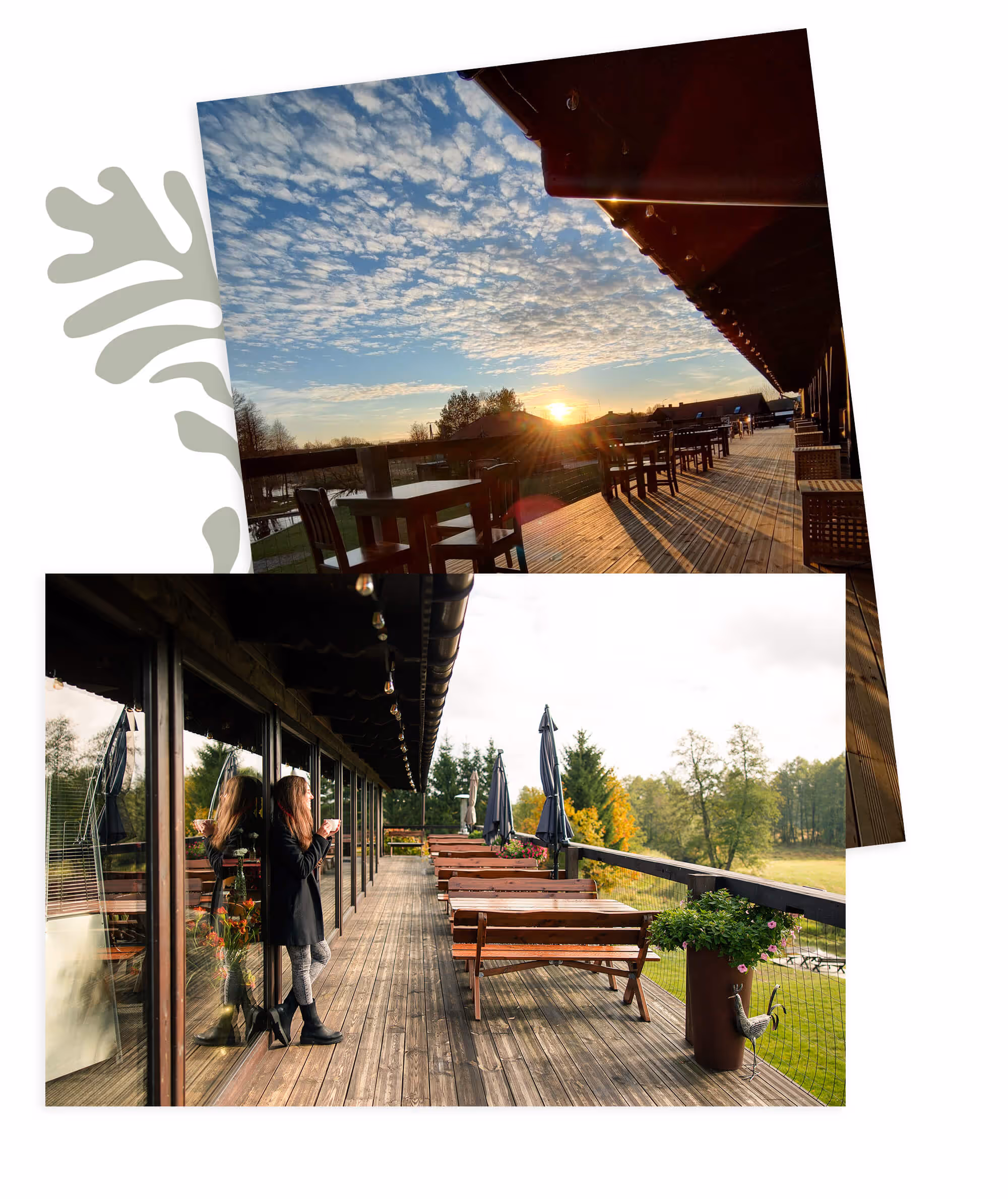 Taras w budynku głównym Gościńca to przestrzeń, która zmienia się wraz z porami roku, zachowując zawsze swój urok. Latem otwarty i przewiewny pozwala poczuć zapach traw i bliskość rzeki. Zimą, dzięki przeszklonym ścianom, staje się przytulnym miejscem z widokiem na białe łąki i lasy. To właśnie stąd rozciąga się panorama na rzekę, szeroką łąkę i linię drzew, które o świcie skrywają się we mgle, a wieczorami malują niebo kolorami zachodzącego słońca. Bywa, że w ciszy można dostrzec dzikie zwierzęta: jelenie, sarny, wilki, a zimą nawet żubry wychodzące na otwartą przestrzeń.