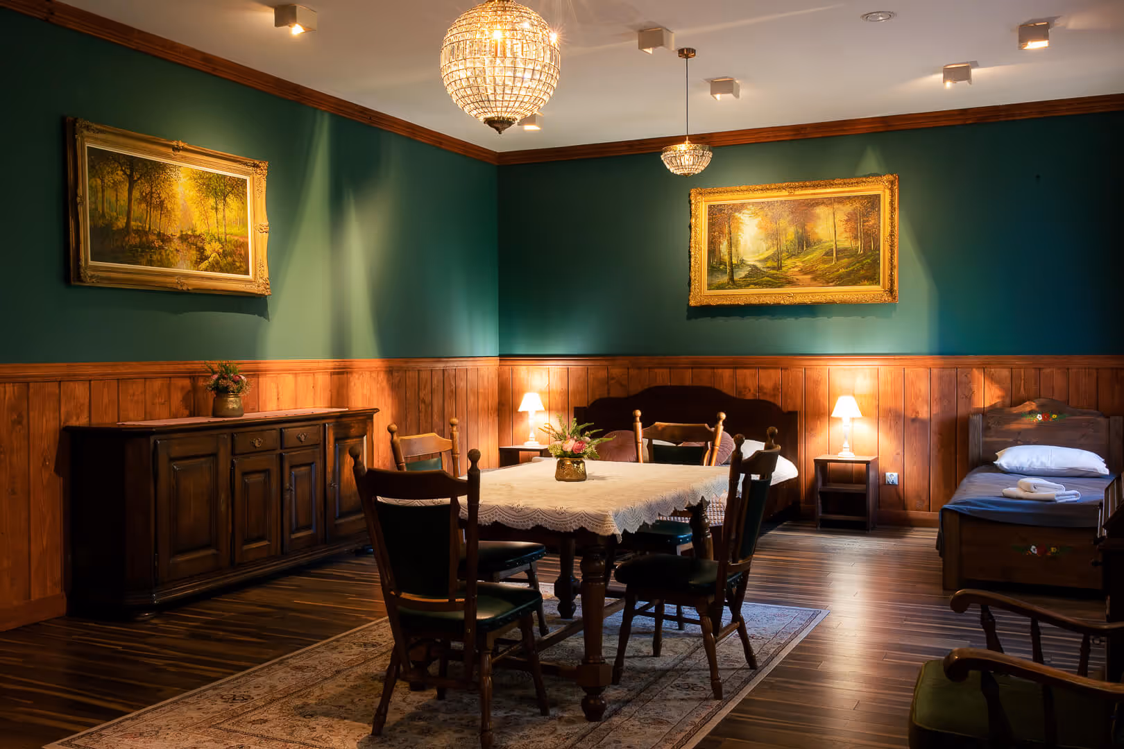 Dwa pokoje trzyosobowe w budynku Czeremcha to jasne, wygodne wnętrza o powierzchni około 25 m², stworzone z myślą o rodzinach i małych grupach. W jednym z nich znajduje się łóżko małżeńskie oraz dodatkowe łóżko pojedyncze – idealne rozwiązanie dla pary podróżującej z dzieckiem. Drugi pokój oferuje trzy osobne łóżka, zapewniając swobodę i komfort niezależnie od potrzeb Gości. Duże okna wychodzące na wschód otwierają widok na Gościniec, a poranne światło nadaje tym przestrzeniom ciepły, przyjazny charakter.